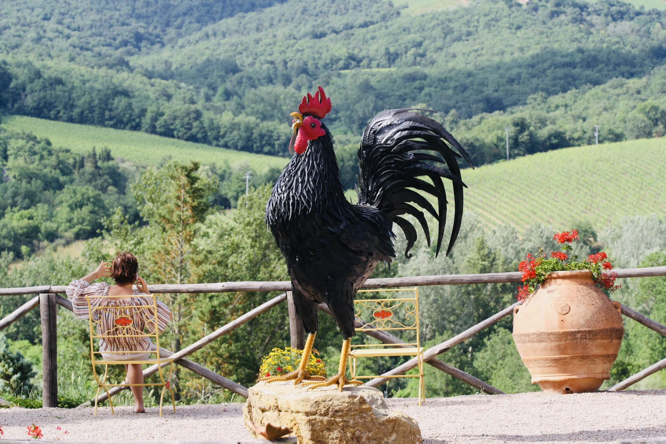 Sitting on the balcony overlooking the 'ocean green', you can read your favourite book and taste fine wines in a purely relaxing atmosphere, with the symbol of Chianti Classico, the majestic Black Rooster!